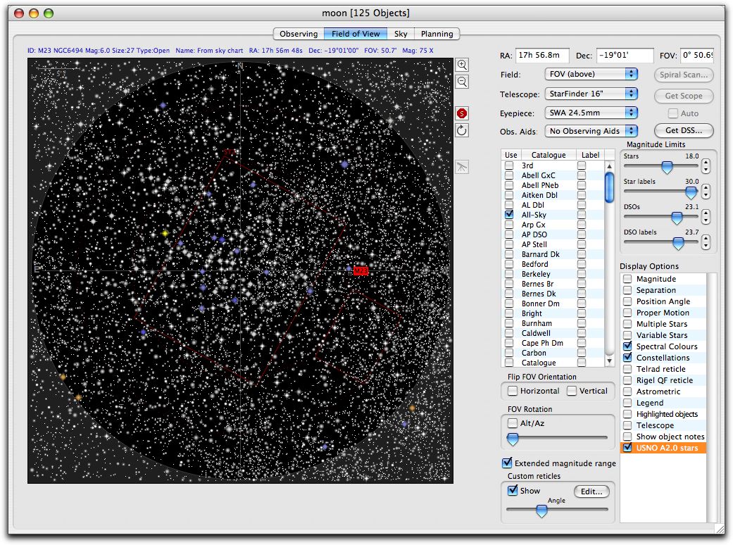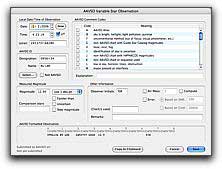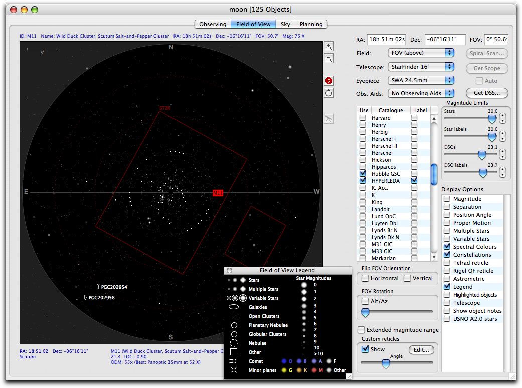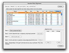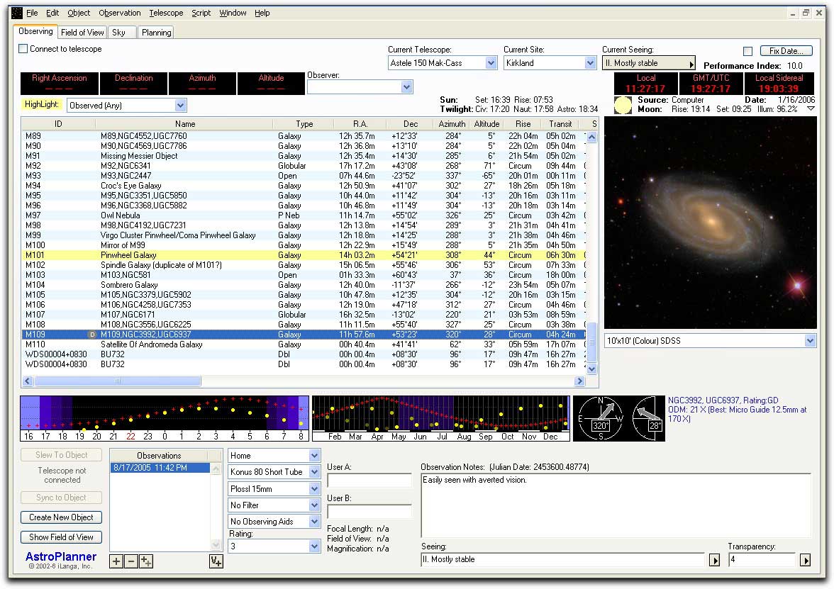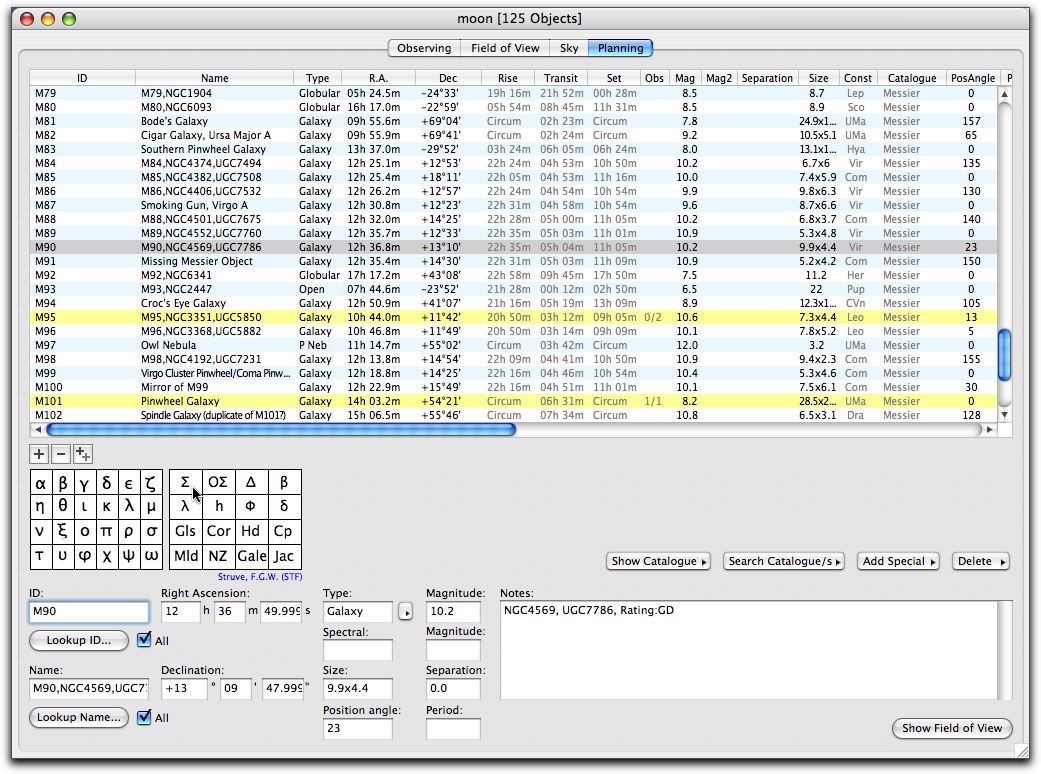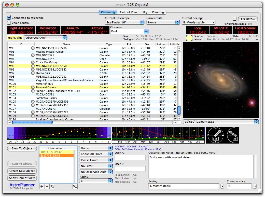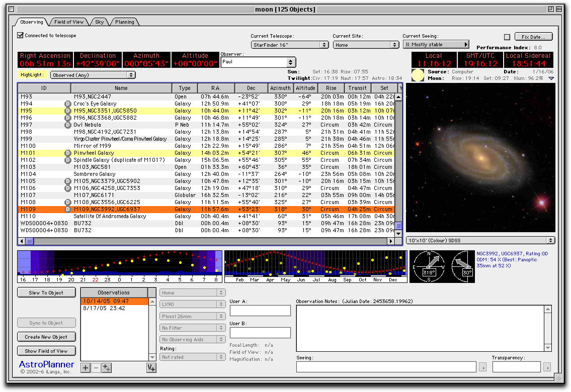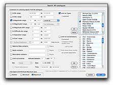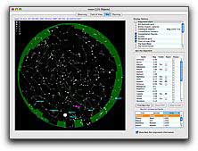 The screen shots below illustrate a number of AstroPlanner's many and varied features. A more exhaustive list of features is available here. Most of the images are from the Macintosh OS X version, but the Mac Classic and Windows versions have vitually identical features.