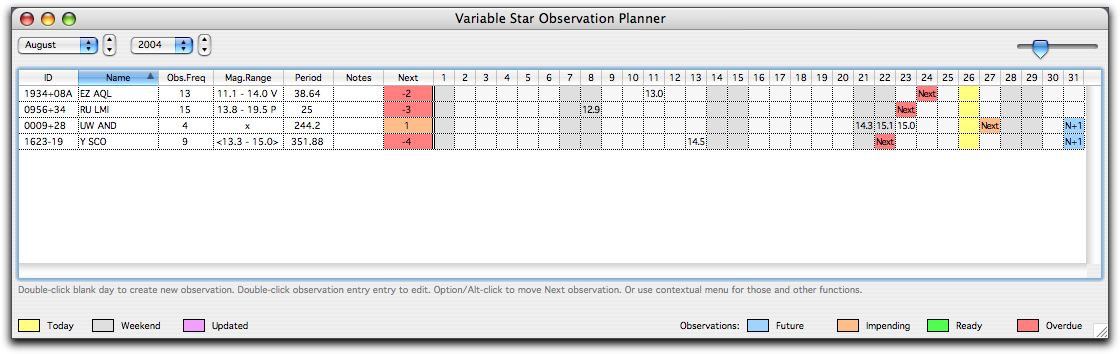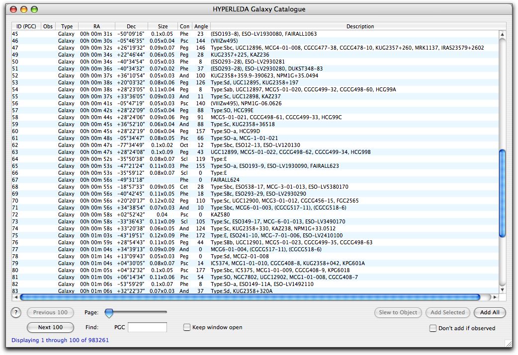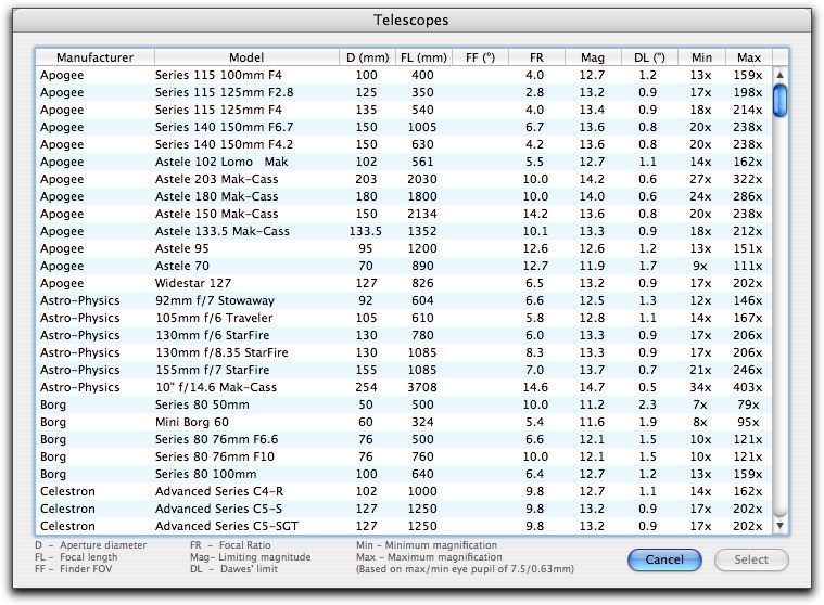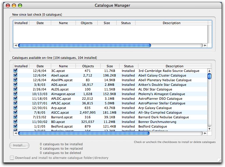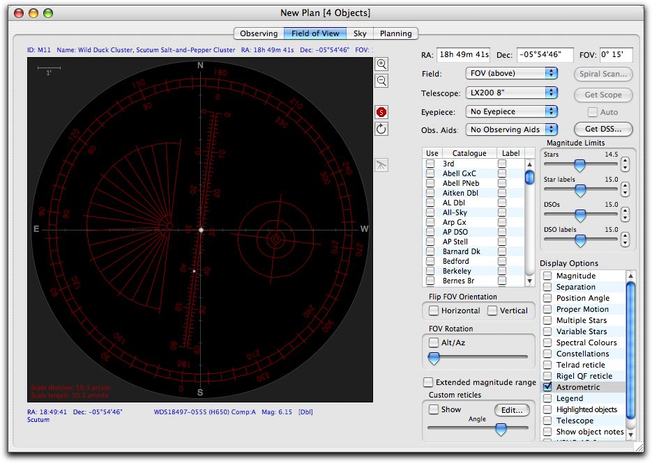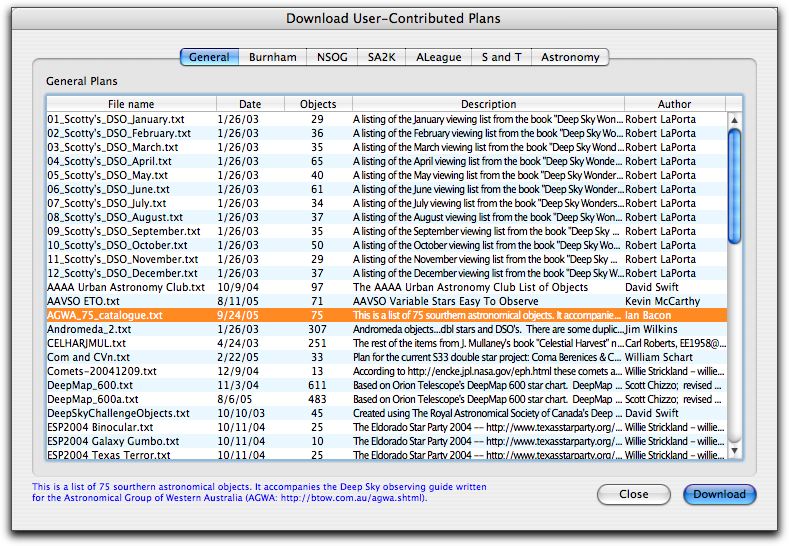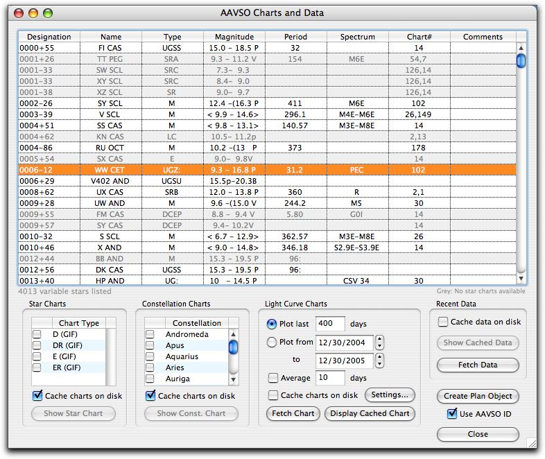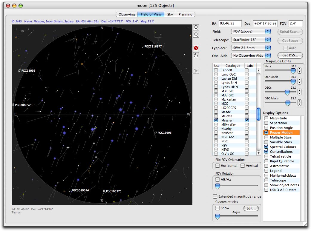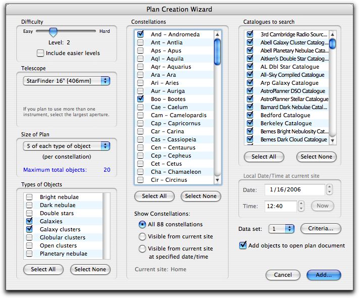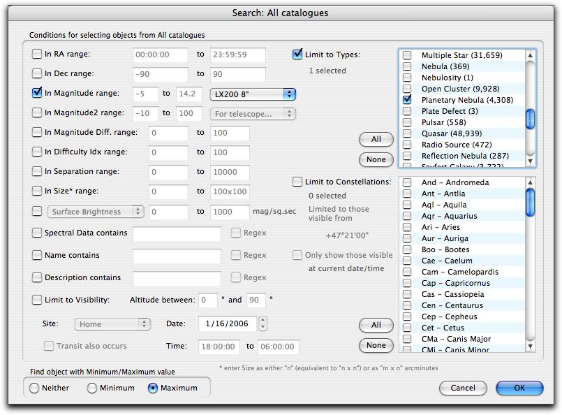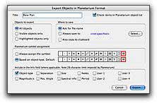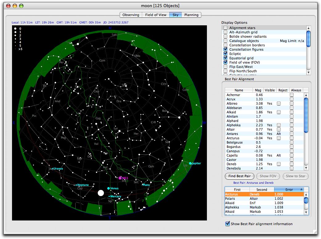 The screen shots below illustrate a number of AstroPlanner's many and varied features. A more exhaustive list of features is available here. Most of the images are from the Macintosh OS X version, but the Mac Classic and Windows versions have vitually identical features.